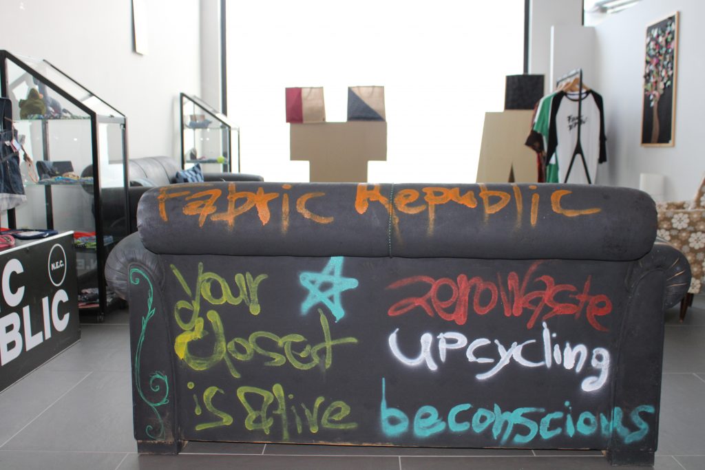 قمنا بزيارة منشأة فابريك ريبابليك في نيا فيلادلفيا ، حيث استرشدنا بمديرة اتصالات المنظمة ، كاكيا كوروفيسي. وعرضت لنا مكان إدارة الملابس وشرحت لنا العملية باكملها . كما أوضحت لنا المكان الذي يتم فيه تدريب المتطوعين الشباب في المنظمة . شعرنا على الفور أنه مكان صديق للبيئة للغاية ، حيث لاحظنا أن العديد من الزخارف تم إنشاؤها وصنعها من الملابس القديمة . لقد أحببت الأريكة ( الكنبة ) ، التي كتبوا عليها رسائل مطلية بالوان الرش عن حماية البيئة ، وكذلك أحببت أيضًا سجادة خضراء تشبه العشب . أوضحت لنا السيدة كوروفيسي : “يتم بذل الكثير من الموارد والجهود لصنع كل ثوب . لذا ، من الجيد ألا ينتهي الأمر بالملابس في مكب النفايات ، ولكن يتم إعادة تدويرها من أجل حماية البيئة “.
