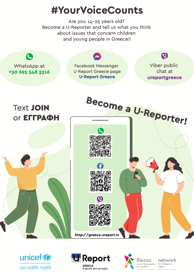 U-Report Greece, from UNICEF Greece Country Office and the Network for Children’s Rights, operates with monthly polls to which participants respond via Viber, Facebook Messenger and WhatsApp. The polls address political and social issues, such as young people’s expectations from local authorities, mental and physical health, childhood obesity and nutrition, climate change and more.